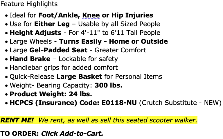 | HCPCS (Insurance) Code | E0118 - (Crutch substitute, lower leg platform, with/without wheels) |