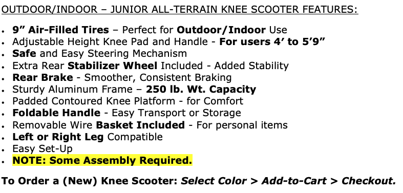 In summary, the KneeRover® All-Terrain Knee Walker-Scooter for Juniors and Small Adults bridges the gap in mobility solutions, ensuring that individuals of smaller stature can access a comfortable, adaptable, and versatile device that supports their recovery process and enables them to participate in daily activities with confidence.