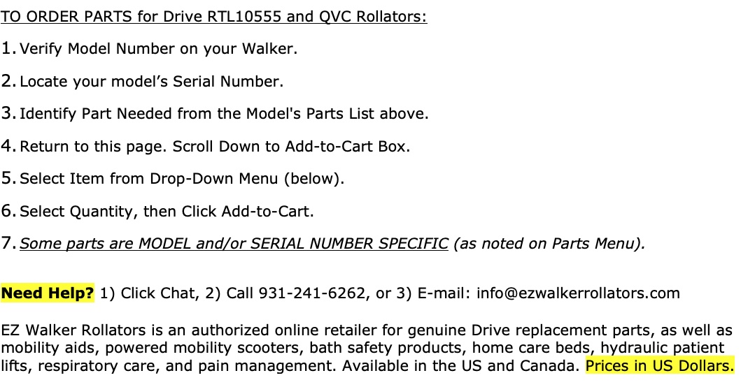 These parts are for Drive RTL10555 rolling walker rollators, along with the QVC models listed below. Prices in US Dollars.