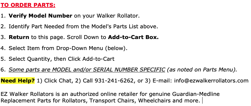 Depending on the model, these rollators feature either 6" or 8" wheels. NOT ALL PARTS FIT ALL MODELS! When purchasing replacement parts for your Medline MDS86850E-Series Rollator, it's essential to ensure you are selecting the correct parts for your specific model. Be sure to have your model and serial number on hand when ordering as some parts are serial number dependant.