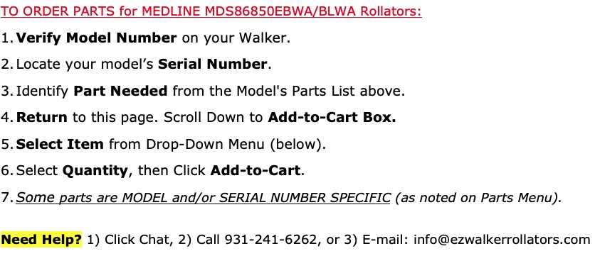 Always make sure to source genuine Medline replacement parts for your MDS86850EBWA and MDS86850EBLWA Rollator Walker from a reputable supplier like EZ Walker Rollators to guarantee compatibility and quality. Additionally, consult the parts diagram by clicking the link below, or your walker's user manual, for specific part numbers. Be sure to have your model and serial number on hand since some parts are serial number dependent.