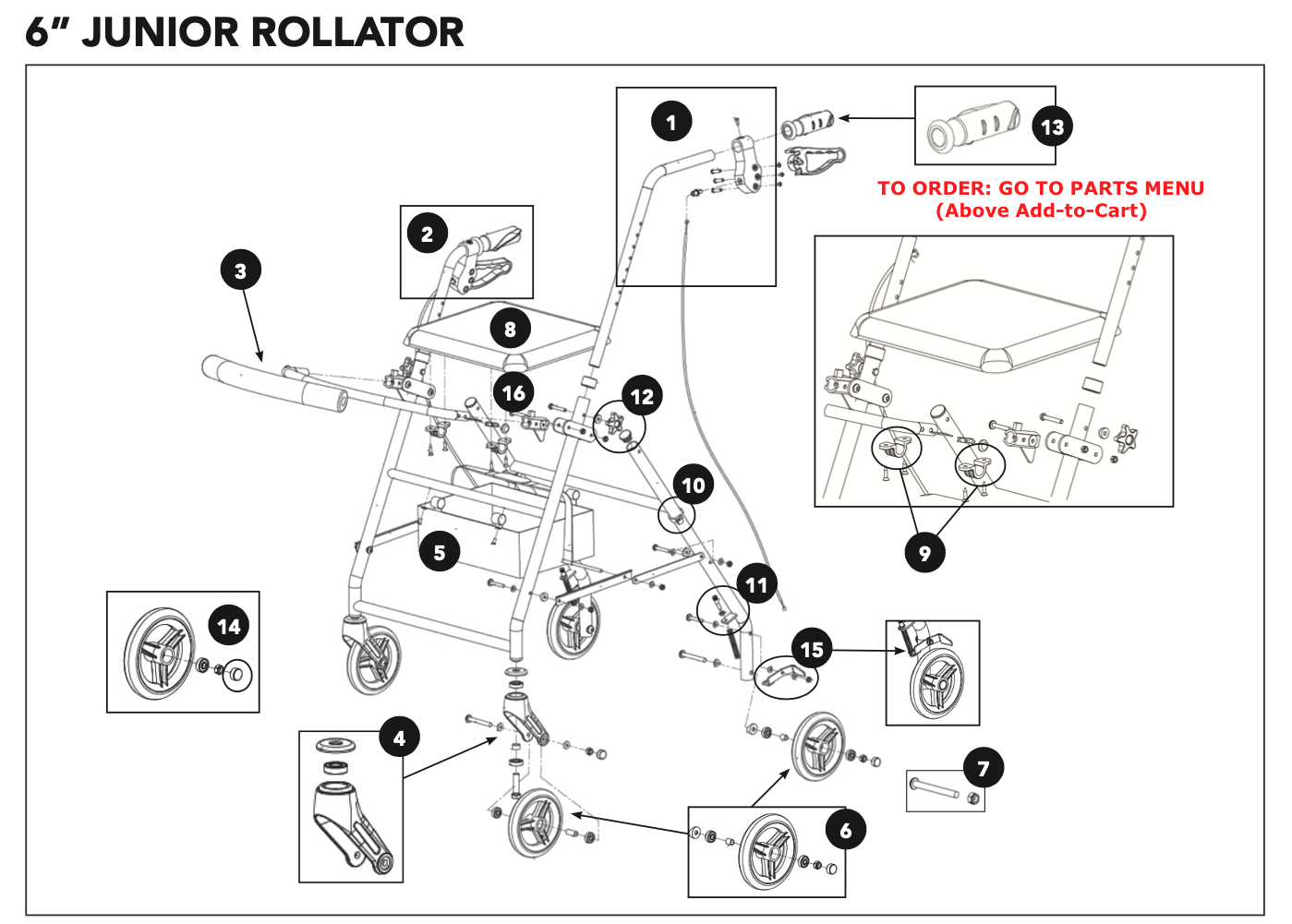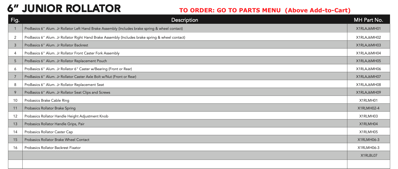 These parts are desiged to fit Probasics Junior Rolling Walker RLAJ6. EZ Walker Rollators sells walker parts for the ProBasics RLAJ6 Rollator and other medical walkers.