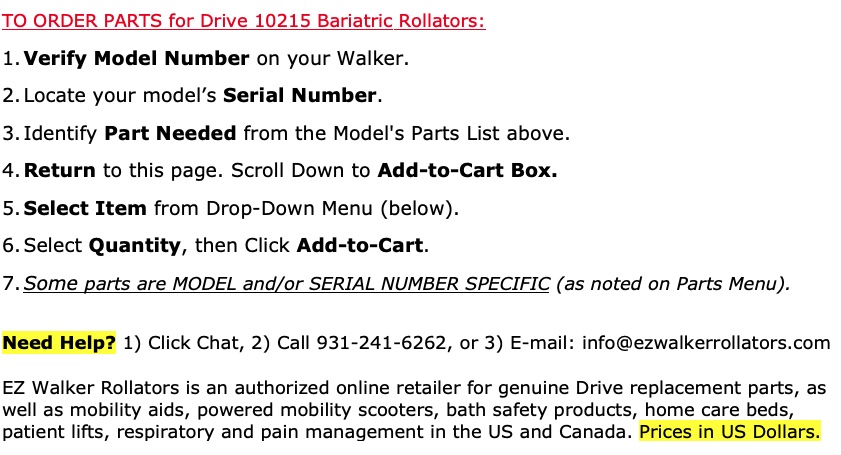 These parts are ONLY for Drive 10208 rolling walker rollators.  Prices in US Dollars.
